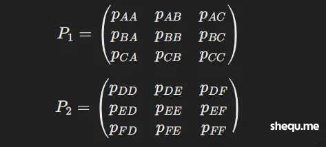 例如,考虑阶段一的状态转移矩阵 P1 和阶段二的状态转移矩阵 P2 :