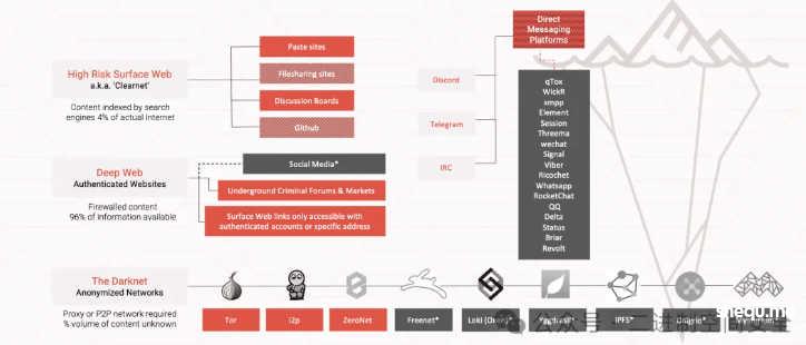 直接消息平台分布于表层网络和深网之间,提供了多种加密通信工具,例如Telegram、Discord、IRC,以及一些去中心化或加密通信平台(如Signal、Session、Wickr等)。